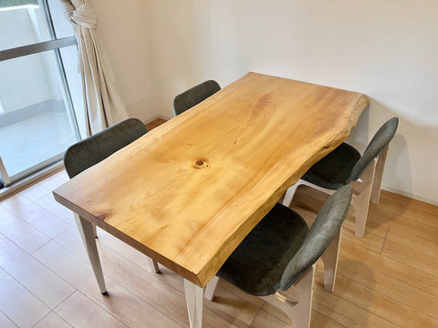 「お部屋のテイストをナチュラルカラーで作っているので、部屋の雰囲気に合うテーブルにしたい。」そんなご希望から、今回は「ミズメザクラ」の一枚板をご提案させていただきました。